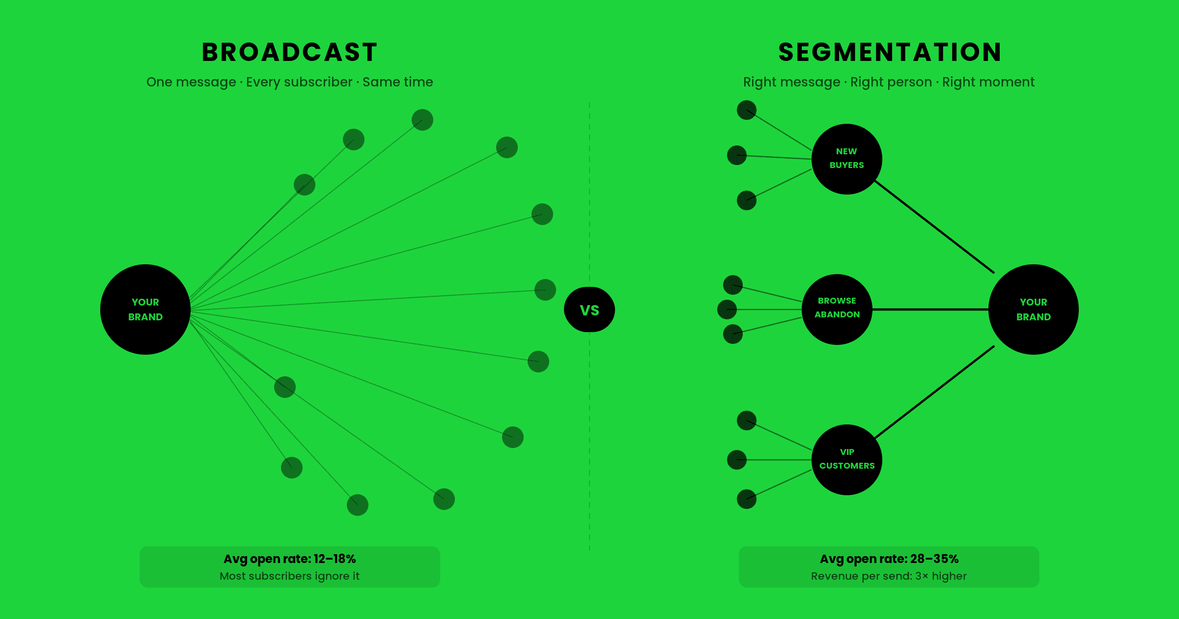 Sending the same four emails to a first-time buyer and a loyal VIP is like giving the same onboarding presentation to a new hire and the CEO. One size fits nobody. Industry benchmarks show unsegmented flows generate 35% to 45% higher unsubscribe rates than segmented ones.