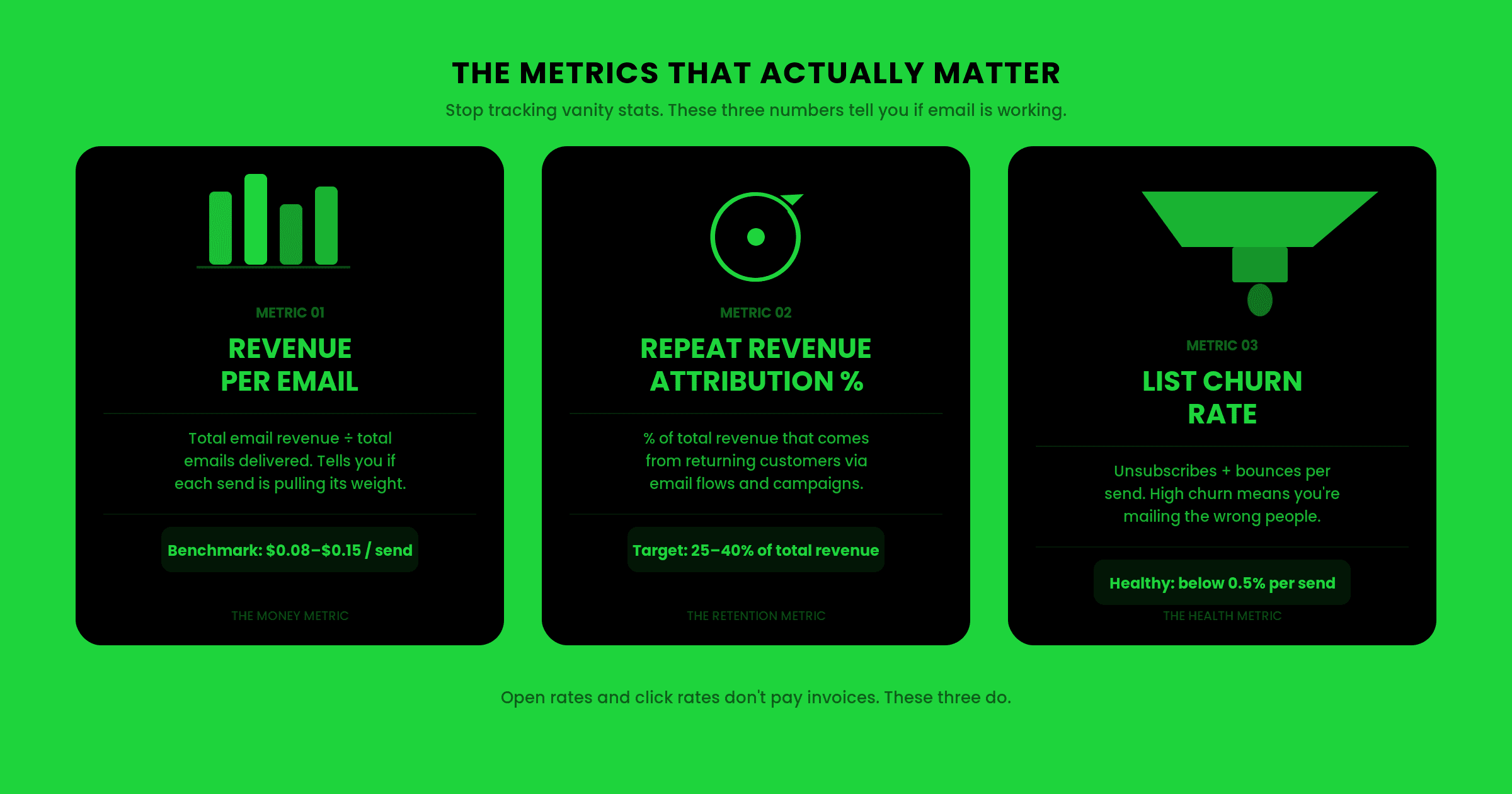Revenue per recipient. Not revenue per email. Revenue per recipient tells you how much each person who enters the flow is worth to your business. Track this monthly and compare across flow versions when you run A/B tests.